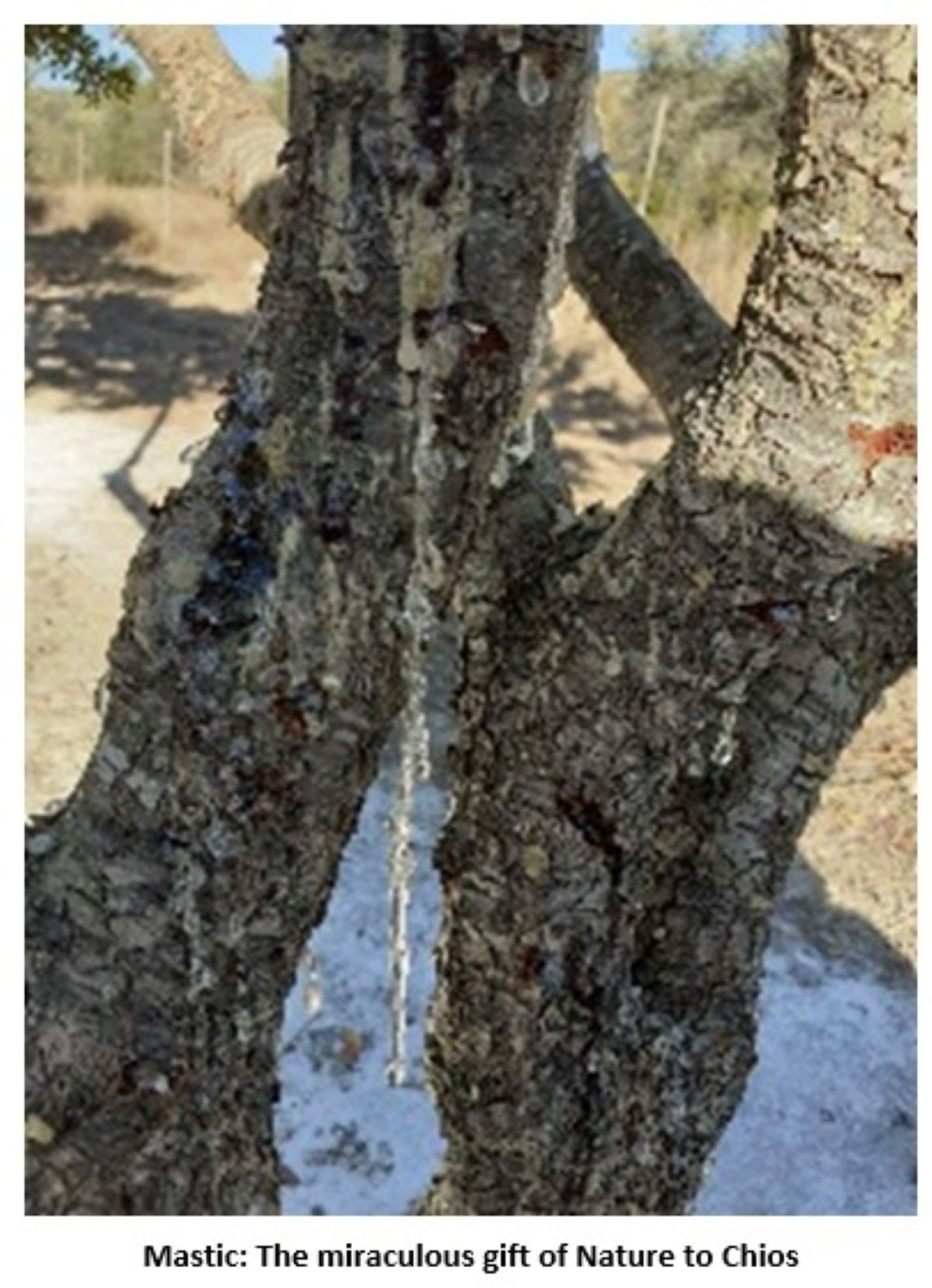 Chios is one of the Greek islands in the Eastern Aegean, at the crossroads of East and West, known worldwide for its mastic. Mastic is a natural aromatic resin produced from the trunk of the mastic tree (Pistacia Lentiscus var. Chia) after shallow cuts are made on the tree’s surface using sharp tools, called “kentitiria”.1 The mastic then exudes as tears with a distinctive fragrance, which either stays on the trunk or drips to the ground covered with white dust to maintain its transparency and purity.