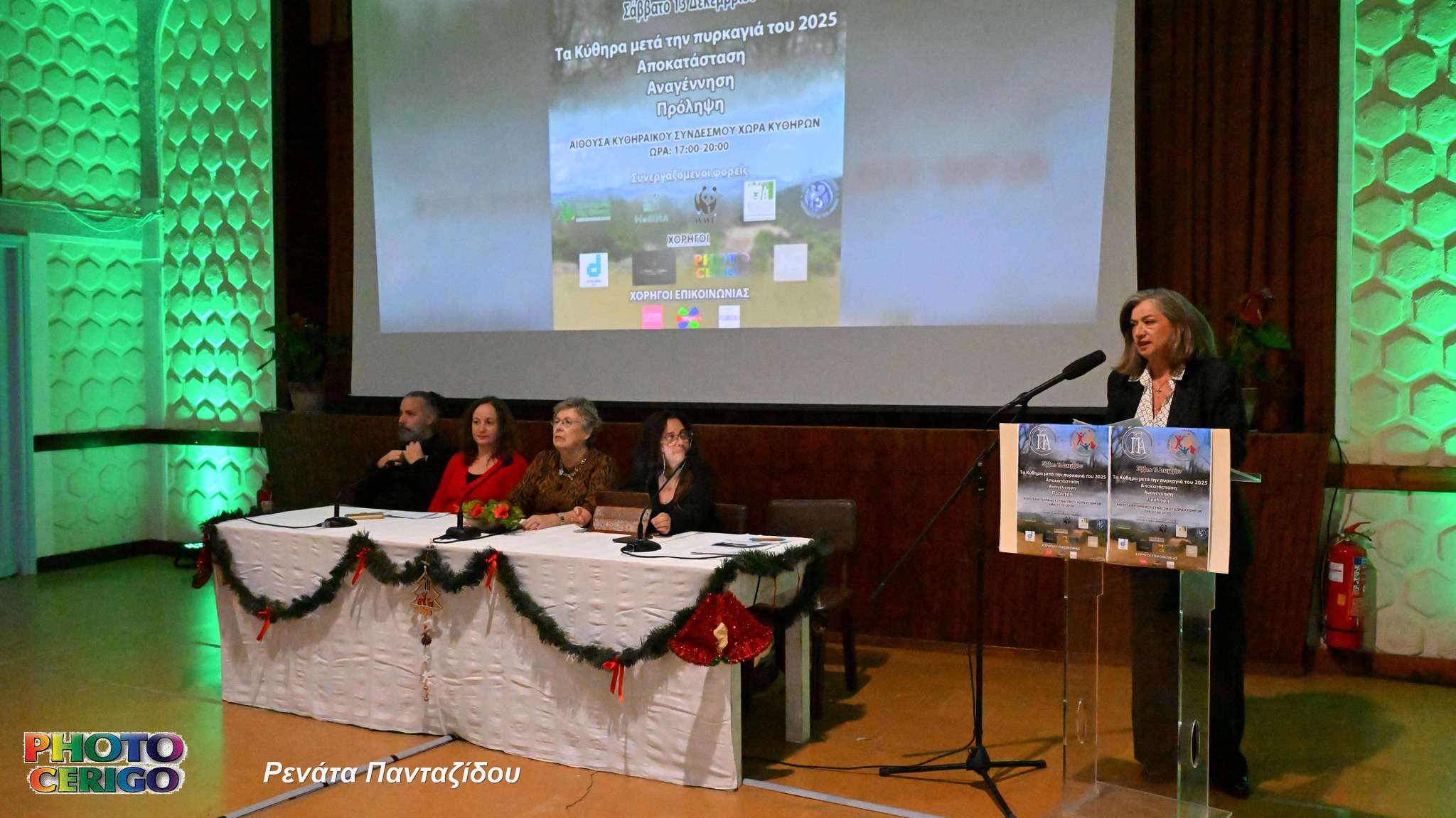 Την εσπερίδα χαιρέτησαν η Κική Μαύρου Πρόεδρος του Κυθηραϊκού Συνδέσμου, η Πέγκυ Βασιλείου, Γενική Γραμματέας του ΚΙΠΑ, ο Γεώργιος Κομηνός, Αντιδήμαρχος Κυθήρων, ο Ευάγγελος Γκουντούφας, Γεν. Δ/ντής Γενικής Διεύθυνσης Δασών και Δασικού Περιβάλλοντος και ο Σωτήρης Καρπούζας, Δασάρχης Πειραιά.
