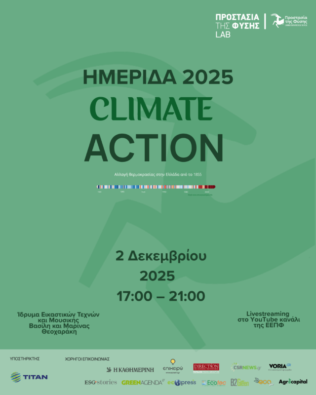 12 Νοεμβρίου 2025 Ημερίδα «Climate Action 2025» – Δηλώστε συμμετοχή Η Ελληνική Εταιρία Προστασίας της Φύσης (ΕΕΠΦ), η πρώτη περιβαλλοντική ΜΚΟ στην Ελλάδα με πάνω από 70 χρόνια συνεχούς δράσης, διοργανών... Περισσότερα